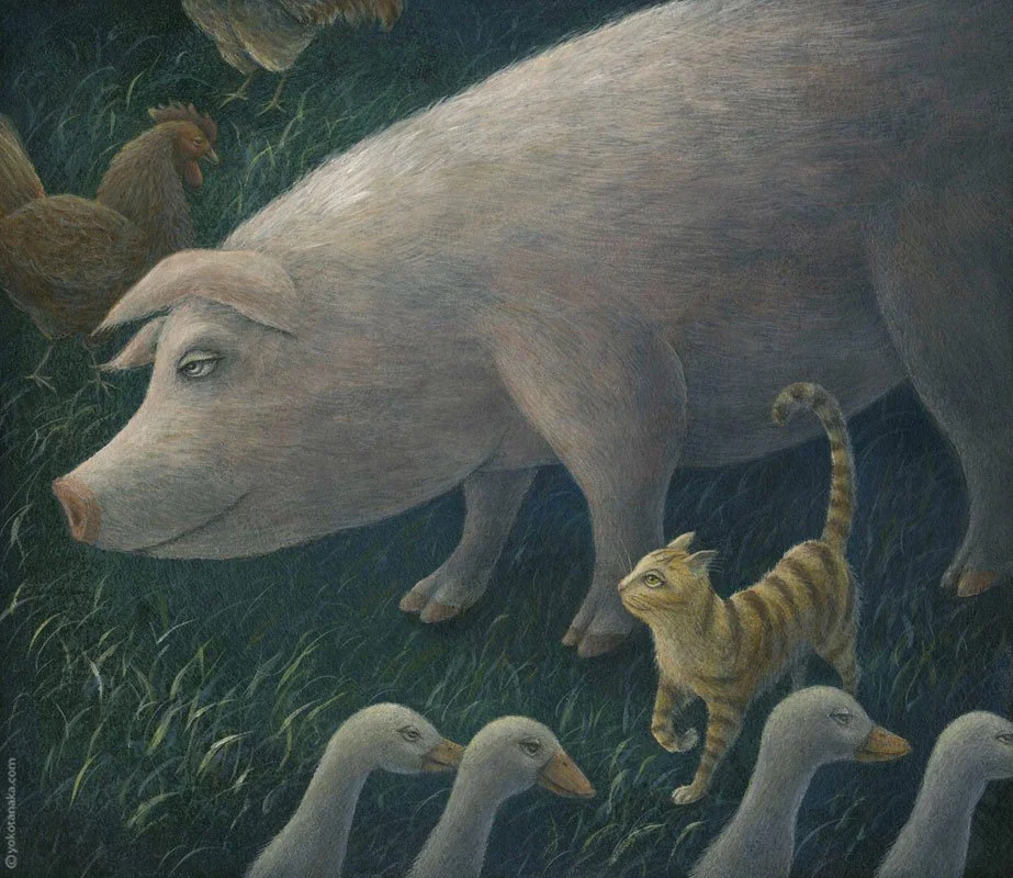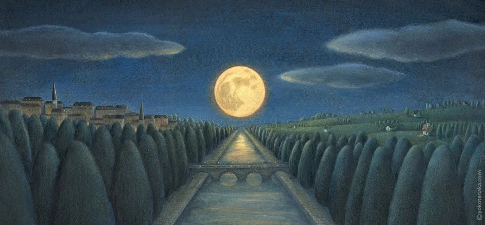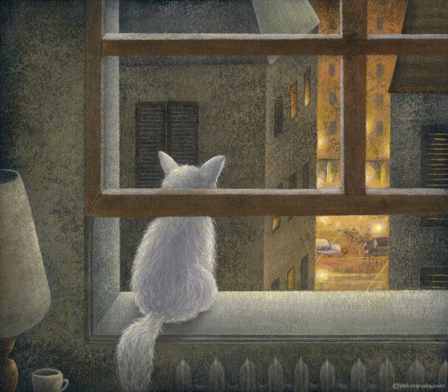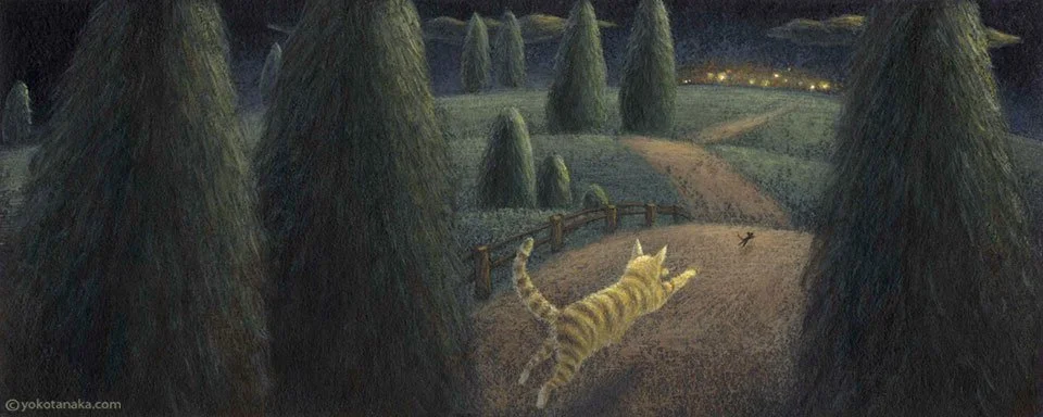 Across a great distance, but under the light of the same moon, a city cat and a country cat pounce and play, crouch and leap in a rollicking nighttime adventure. When morning comes, they are both back in their respective homes and finally, turn in to sleep.”